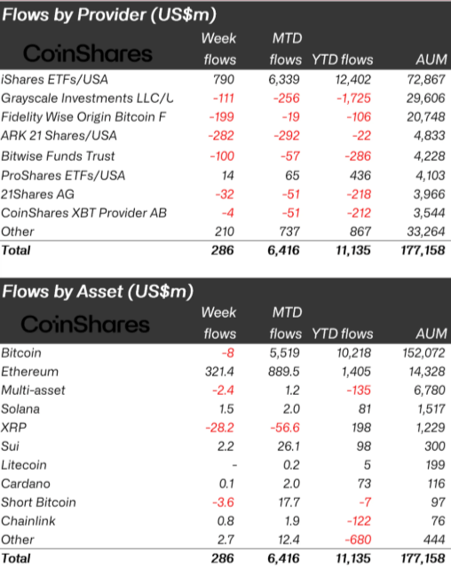 Kripto yatırım ürünleri geçen hafta büyük giriş aldı. CoinShares, 30 Mayıs’ta biten haftada toplam 286 milyon dolarlık net giriş yaşandığını açıkladı.