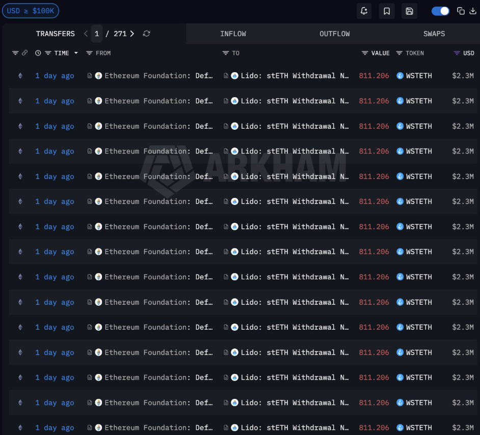 Arkham verilerine göre Ethereum Foundation, Lido üzerinden wstETH pozisyonunu çözerek 17.035 ETH’yi unstake etti. Bu varlıkların değeri yaklaşık 40 milyon dolar seviyesinde hesaplanıyor.