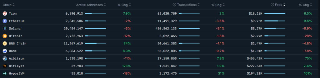 Zincir üstü veriler, ETH talebinin sürdüğünü ve güçlü temellere sahip olduğunu gösteriyor. DefiLlama verilerine göre ETH, toplam kilitli değerin %60’ını kontrol ediyor ve ağ ücretleri son haftada %38 artarak 11,2 milyon dolara yükseldi. Karşılaştırmalı olarak Solana’nın ücretleri %3 artarken, BNB Chain gelirleri %3 düştü. Son 30 günde merkezi olmayan borsa hacmi 129,7 milyar dolara ulaşırken, Ethereum lider konumunu koruyor.