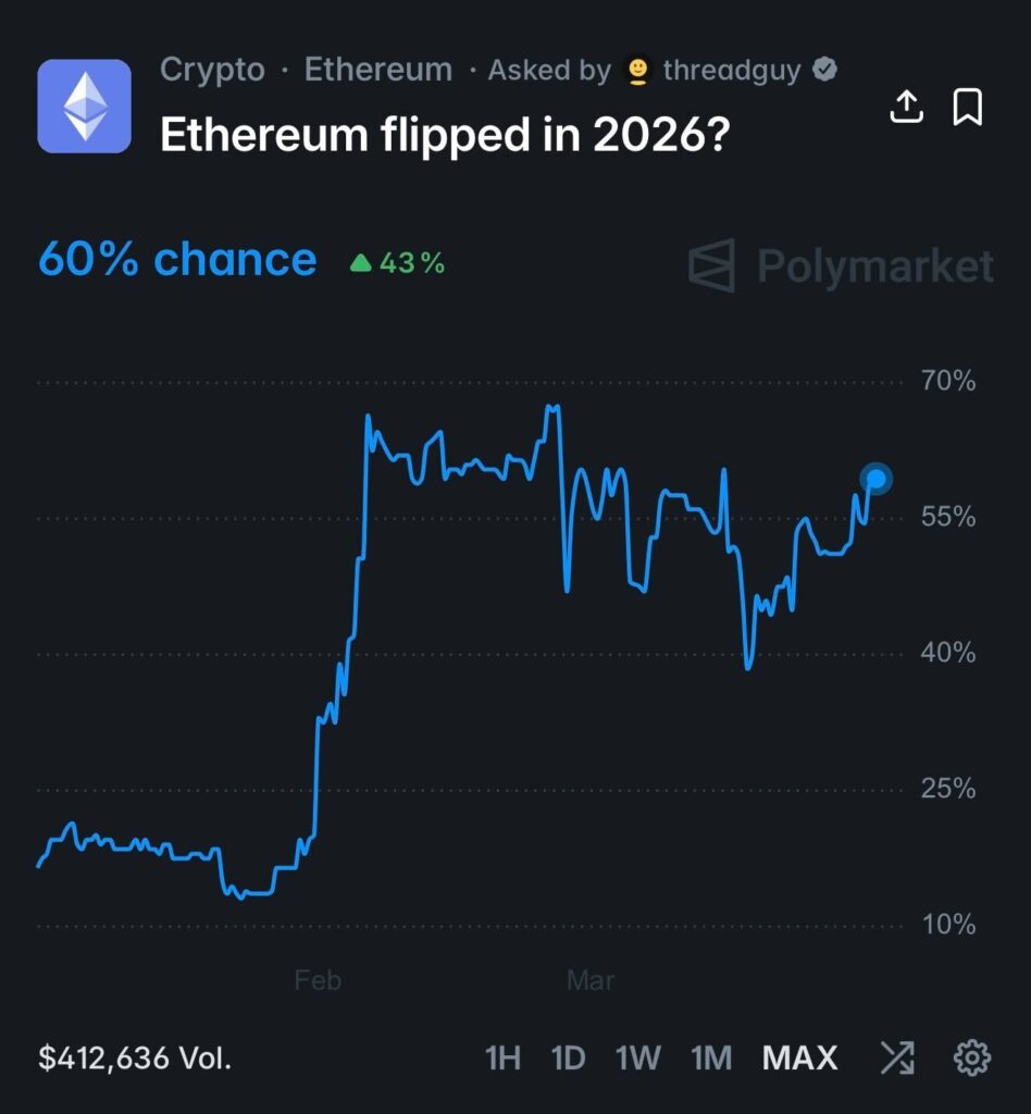 Tahmin piyasası Polymarket, 2026 içinde Ethereum’un ikinci sırayı Tether tarafından çıkarılan USDT’ye kaptırma ihtimalini yaklaşık %60 olarak fiyatlıyor. Yıl başında bu oran %17 seviyesindeydi.