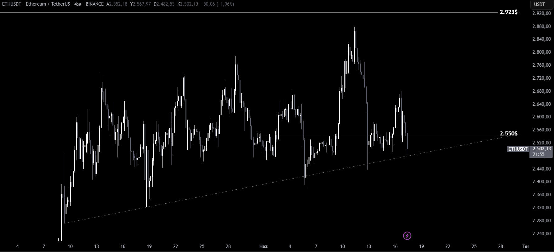 Son 4 saatlik grafiklerde ETH, 2.550 dolara yeniden yaklaştı ve bu seviyeyi zorlamaya başladı. Teknik analizler, bu seviyenin altına yaşanacak bir kırılımın domino etkisi yaratabileceğine işaret ediyor. Özellikle destek kaybedilirse sıradaki hedef 2.350 dolar olarak öne çıkıyor.