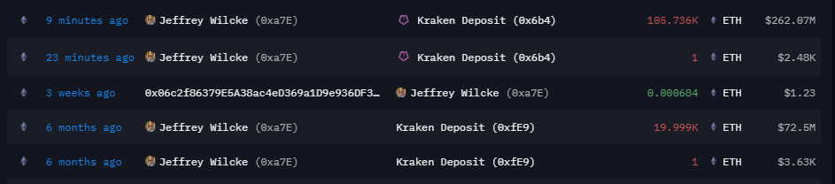 Kripto para piyasalarında volatilite yeniden kendini hissettirirken, Ethereum (ETH) cephesinde dikkat çeken bir gelişme yaşandı. Ethereum’un kurucu ortaklarından Jeffrey Wilcke, kısa süre önce önemli bir hamlede bulundu. Yapılan zincir üstü işlemlere göre Wilcke, yaklaşık 262 milyon dolar değerinde olan 105.736 adet ETH‘yi Kraken borsasına aktardı. Bu gelişme, piyasada satış baskısına dair endişeleri yeniden gündeme taşıdı.