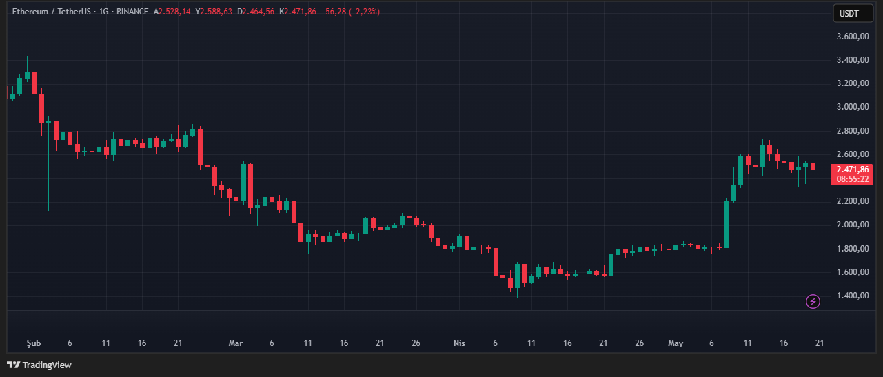 Anlık olarak Ethereum 2.471 dolar seviyesinde, son 24 saatte -%2,20’lik bir performans sergilemekte.