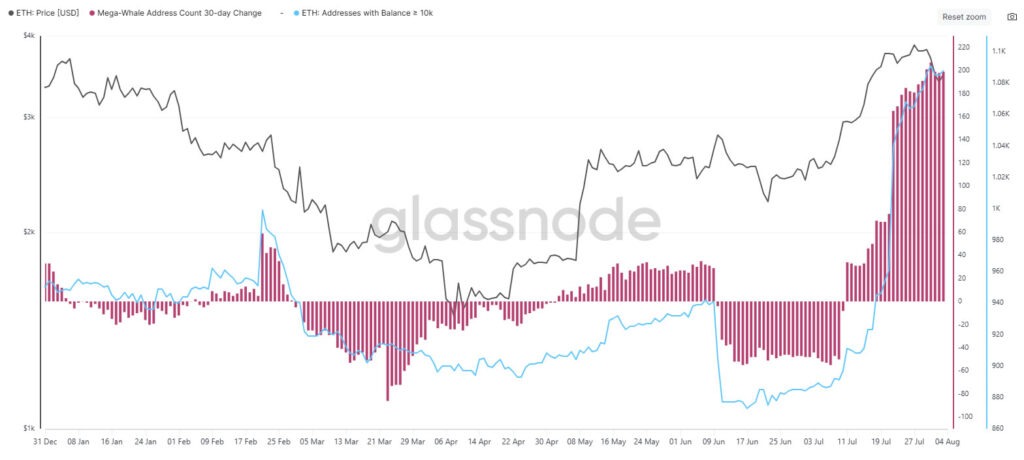 Glassnode verileri de Ethereum “mega balina” sayısındaki artışı doğruluyor. 10.000 ETH üzerinde tutan adres sayısı Temmuz ayı başından bu yana 200’ün üzerinde artış gösterdi.