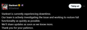 Starknet ekibi, resmi X hesabı üzerinden yaptığı paylaşımda kesintiyi doğruladı. Açıklamada: