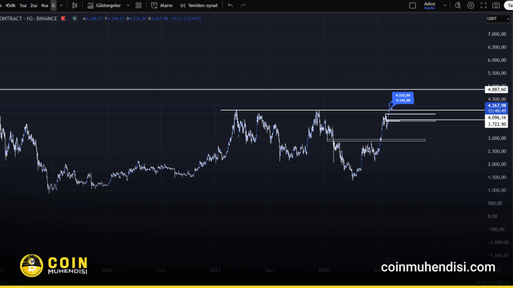 Daha düşük zaman diliminde baktığımızda, fiyatın yeni bir tepe oluşturamayıp yalnızca likidite alımıyla sınırlı kaldığını görüyoruz. 4.333$ üzerinde 4 saatlik bir kapanış gelmediği sürece, alt tarafta bıraktığı likiditeleri almak isteyebilir. Son onaylı tepesini oluşturan 4.142$ seviyesindeki likidite hâlâ açık durumda. Bu bölgeden alacağı likiditeyle yukarı yönlü yeni bir tepe hedefleyebilir.
