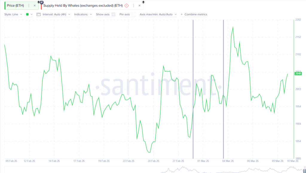 Balinaların davranışları da değişti. Büyük yatırımcılar, 7 Mart’taki 113,70 milyon ETH’lik arzlarını 10 Mart’ta yaklaşık 113,61 milyon ETH’ye düşürerek yaklaşık 90.000 ETH’lik bir azalma sağladılar. Bu kombinasyon, son toparlanmanın, daha önceki %15’lik ETH fiyat artışını destekleyen birikim desteğinden yoksun olduğunu gösteriyor.