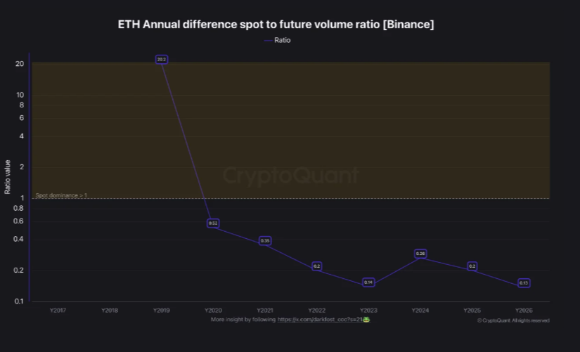 Aynı zamanda borsadaki spot–futures işlem hacmi oranı 0,13 seviyesine düştü. Bu, Ethereum için kaydedilen en düşük yıllık seviye olarak dikkat çekiyor.