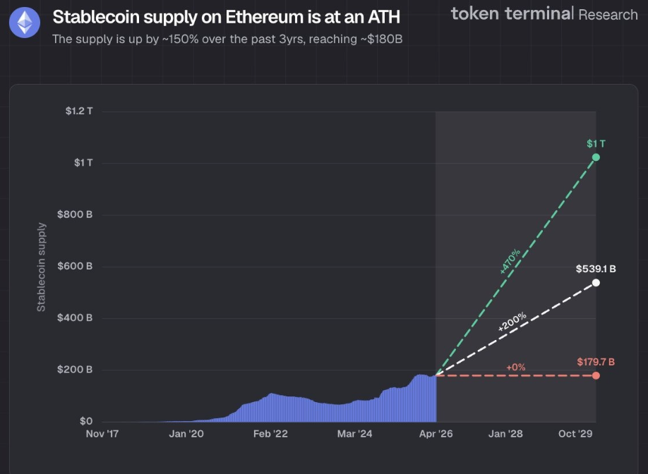 Token Terminal verilerine göre, önümüzdeki dört yıl boyunca tüm ağlarda yaklaşık 1,7 trilyon dolar değerinde onchain akış bekleniyor. Ethereum’un bu pastadan 850 milyar dolarlık “yeni akış” alabileceği öngörülüyor; bu, 2030’a kadar %470 büyüme anlamına geliyor.