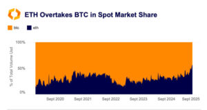 Kripto para piyasasında tarihi bir gelişme yaşandı: Ethereum’un (ETH) merkezi borsalardaki (CEX) aylık spot işlem hacmi, en az yedi yıldır ilk kez Bitcoin’i (BTC) geçti.