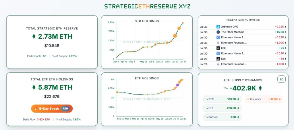 Ethereum, 10. yaş gününü kutlarken kurumsal ilgi yeniden zirveye çıktı. Son veriler, şirketlerin elinde tuttuğu stratejik ETH rezervlerinin toplam değerinin 10 milyar doları aştığını gösteriyor. Bu rezervler toplamda 2,73 milyon ETH‘ye ulaştı.