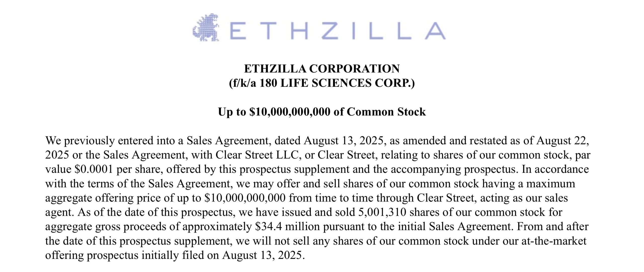 ETHZilla, 13 Ağustos 2025’te imzalanan ve 22 Ağustos 2025’te güncellenen bir “Satış Anlaşması” kapsamında Clear Street LLC ile ortaklık kurdu. Bu anlaşma doğrultusunda, ETHZilla zaman zaman toplamda 10 milyar dolara kadar olan hisse satışlarını Clear Street aracılığıyla gerçekleştirebilecek.