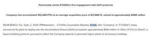 31 Ağustos 2025 itibarıyla ETHZilla’nın elinde yaklaşık 456 milyon dolar değerinde 102.246 ETH bulunuyor. Şirketin ETH başına ortalama maliyeti ise 3.948,72 dolar. Bunun yanı sıra ETHZilla’nın yaklaşık 221 milyon dolar nakit rezervi bulunuyor. Bu güçlü finansal yapı, şirketin DeFi alanındaki yeni hamlelerini destekleyici nitelikte.