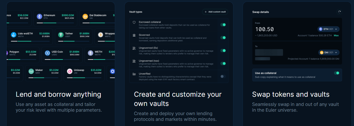 Euler, modüler yapısı ve yenilikçi özellikleriyle DeFi dünyasında fark yaratır. İşte protokolün temel bileşenleri ve özellikleri: