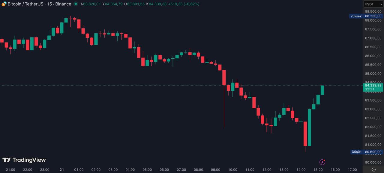 Açıklamaların ardından Bitcoin kısa sürede 84.000 dolar seviyesine tırmandı. Makro belirsizliklere rağmen gelen bu tepki, piyasada hâlâ güçlü bir alıcı tabanının bulunduğunu gösterdi.