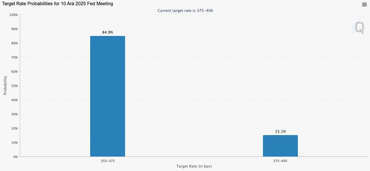 Beige Book’un yayımlanmasının ardından para piyasalarında Fed’in 10 Aralık’ta 25 baz puanlık faiz indirimi yapma ihtimali yüzde 84,9’a yükseldi. Bu beklenti, piyasalarda iyimser bir hava yarattı.
