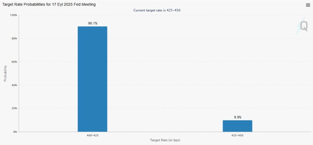 CME Group’un FedWatch Tool verilerine göre, 17 Eylül tarihli FOMC toplantısında 25 baz puanlık bir faiz indirimi olasılığı %90.1 seviyesine çıktı. Bu oran, günün erken saatlerinde %89,1 olarak hesaplanmıştı. Yani beklentiler gün içinde ciddi ölçüde güç kazandı.