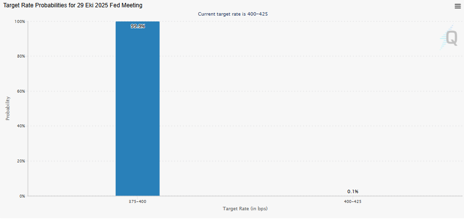Şikago Borsası’nda yayımlanan CME Fed Watch Tool verilerine göre, bu olasılık %99,9 seviyesinde fiyatlanıyor. Ancak piyasalar, faiz indiriminden çok Fed Başkanı Jerome Powell’ın açıklamalarına odaklanmış durumda.
