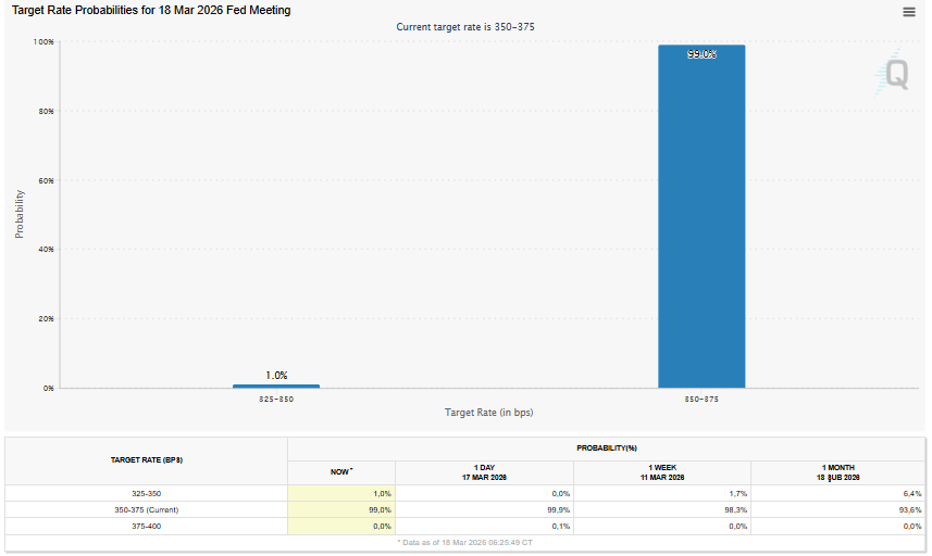 Mevcut fiyatlamalara bakıldığında, piyasanın Federal Reserve’in faiz oranlarını sabit tutmasına neredeyse kesin gözüyle baktığı görülüyor. Beklentiler, politika faizinin 350–375 baz puan aralığında korunacağı yönünde şekillenmiş durumda.