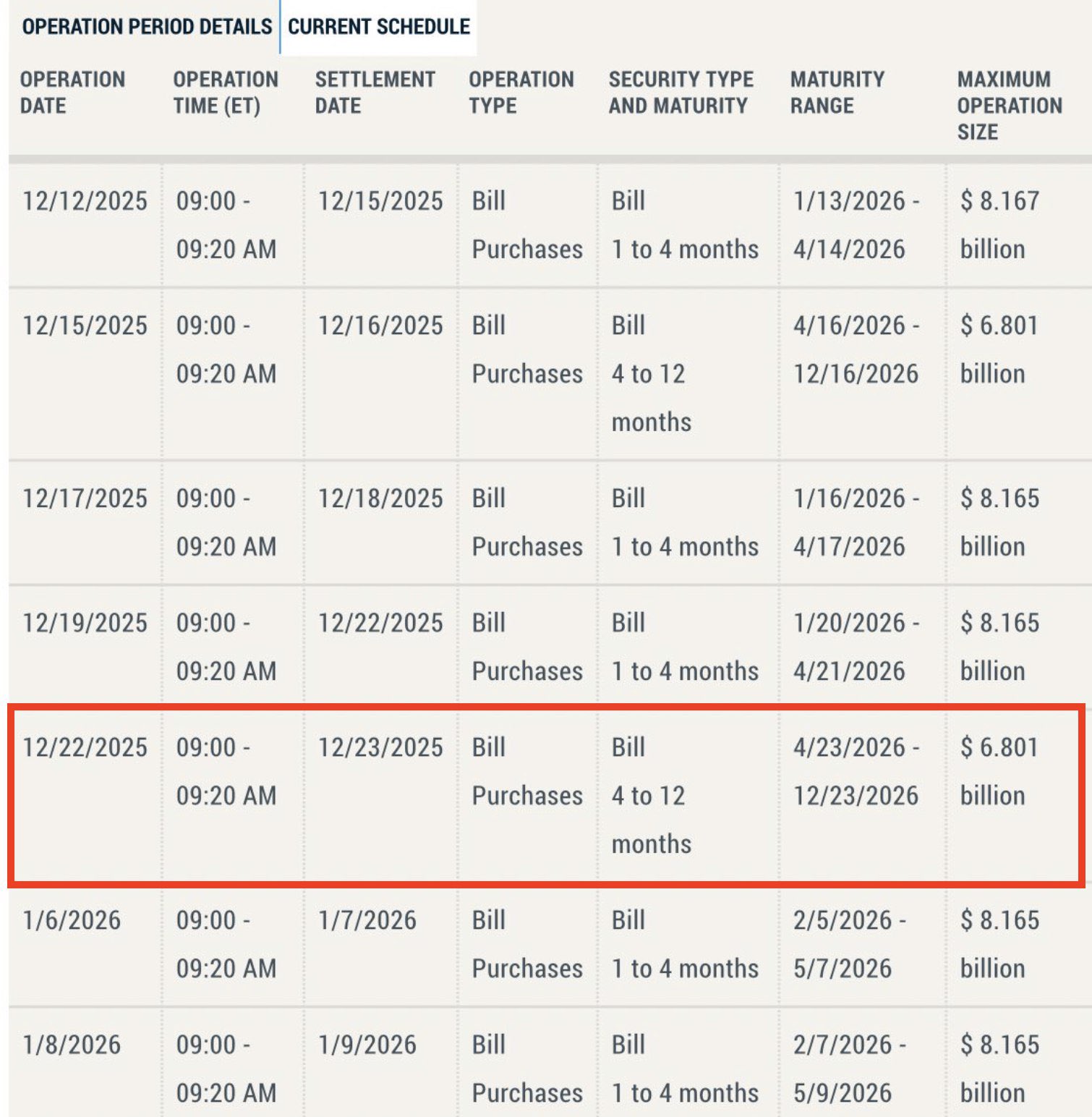 Fed’in güncel programında yer alan bilgilere göre, söz konusu likidite enjeksiyonu Hazine bonosu (Treasury Bill) alımları yoluyla yapılacak. “Current schedule” altında belirtilen plana göre Fed, 4 ila 12 ay vadeli Hazine bonolarını kapsayan bir alım gerçekleştirecek. Bu alımların vade aralığı 23 Nisan 2026 – 23 Aralık 2026 tarihlerini kapsıyor ve toplam tutar 6,801 milyar dolar seviyesinde.