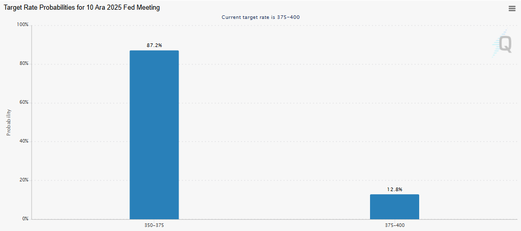 Piyasanın bundan sonraki ana odağı ise 10 Aralık’ta gerçekleşecek FOMC toplantısı. Güncel olasılıklara göre piyasalar yüzde 87,2 ihtimalle 25 baz puanlık bir faiz indirimi beklerken, sabit bırakılma ihtimali yüzde 12,8 seviyesinde bulunuyor. Bu beklenti dağılımı, yatırımcıların para politikasında yumuşamaya oldukça yakın olduğuna inandığını gösteriyor.