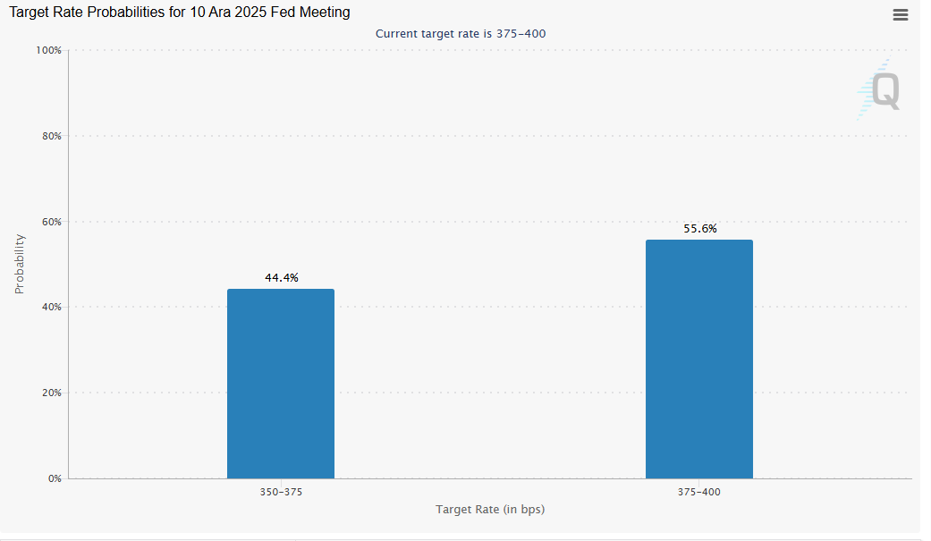 CME Group’un FedWatch Tool verileri de piyasalardaki beklentinin ne yönde şekillendiğini gösteriyor. 10 Aralık’taki FOMC toplantısına 25 gün kala oranlar şu şekilde: