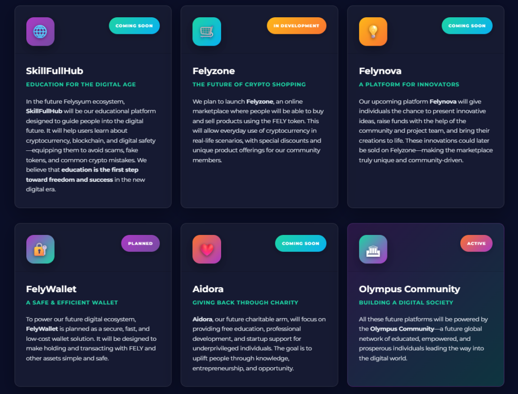 Felysyum, dijital dünyanın kahramanları için modern bir Elysium inşa etmeyi amaçlar. Eğitim platformu, inovasyon fonlama merkezi, kripto destekli alışveriş alanı ve sosyal yardım programı gibi farklı modüller, proje vizyonunun temel taşlarını oluşturur.