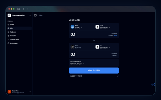 Kullanıcılar, frxUSD için fiat veya teminat yatırır, saklayıcılar aracılığıyla mint edilir.