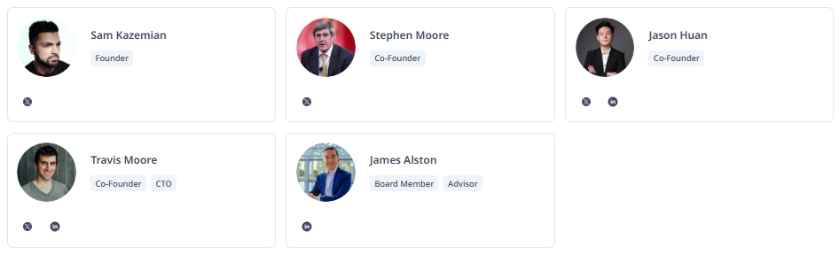 Frax ekibi, Sam Kazemian, Stephen Moore, Jason Huan, Travis Moore ve James Alston’dan oluşur. Kazemian’ın liderliğinde, ekip DeFi ve stablecoin inovasyonuna odaklanır.