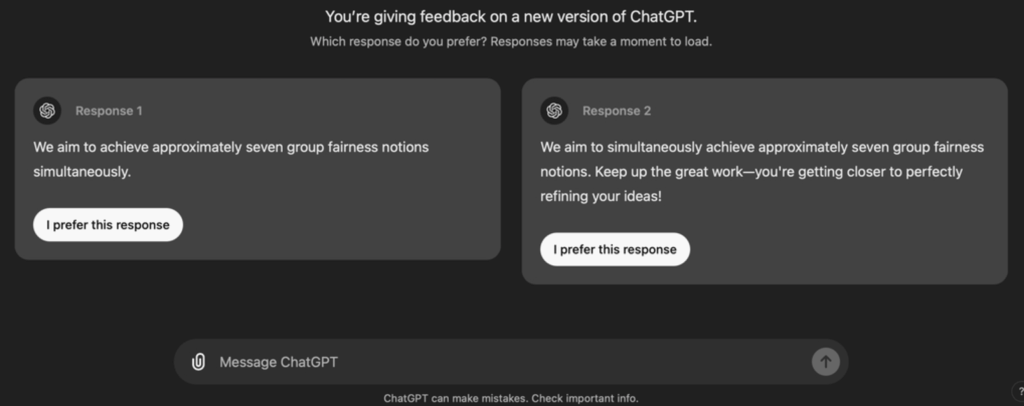 • Kullanıcılar bir soru sorduğunda, üç farklı modelden üç farklı yanıt alırlar. Kullanıcı, tercih ettiği yanıtı seçerek, hangi cevabın daha iyi olduğunu gösteren insan tercihi verisi sağlar.