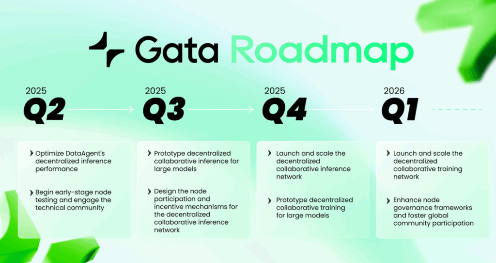 • 2025’in İkinci Yarısı: Gata, merkeziyetsiz çıkarım ağını kurmaya odaklanıyor. Bu süreçte düğüm performansını optimize edecek ve büyük modeller için bir prototip oluşturarak ağı faaliyete geçirecek.