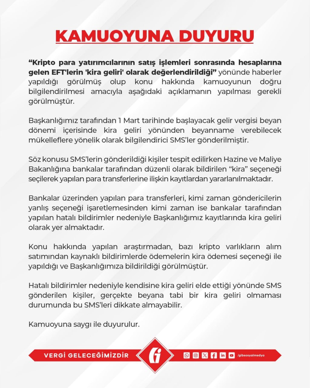 GİB, gerçek kira geliri olmayan kişilere gönderilen SMS’lerin hatalı olduğunu ve bu kişilerin vergi beyannamesi yapmalarına gerek olmadığını vurguladı. Yatırımcılara, banka transferlerinin doğru bildirilmesi gerektiği ve bankaların daha dikkatli olması gerektiği belirtildi. Başkanlık, bu açıklama ile yanlış anlamaların önüne geçmeyi ve doğru bilgi akışını sağlamayı amaçladığını ifade etti.