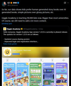 Küresel kripto dünyasının en tanınan isimlerinden biri olan CZ, Giggle Academy hakkında önemli bir değerlendirme yaptı. Paylaşılan verilere göre platformdaki çocuk kullanıcılar, yapay zekâ tarafından oluşturulan hikâye kitapları yerine insan yapımı hikâyeleri daha çok benimsiyor. Ayrıca parlak ve karmaşık görsellerdendense basit ve sade resimlerin çocuklar tarafından daha fazla tercih edildiği belirtiliyor.