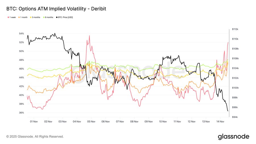 Glassnode verilerine göre, Bitcoin $100.000 seviyesini kırdıktan sonra opsiyon piyasasında hareketlilik hızlandı. Yatırımcılar, fiyatın düşüşüne karşı put alımları (düşüşten korunma amaçlı opsiyonlar) ile pozisyonlarını koruyor. Kısa vadeli belirsizlik yükseldi; 1 haftalık volatilite beklentisi (IV – implied volatility, yani fiyatın kısa vadeli dalgalanma beklentisi) %51’e, 6 aylık IV ise %48’e çıktı ve son 2 haftada 3 puan arttı.