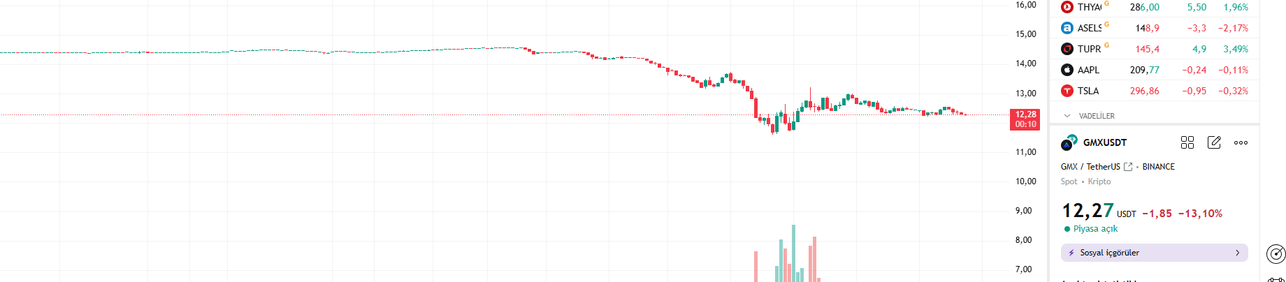 Haberlerinin yayılmasıyla birlikte GMX fiyatı 14.09 dolar seviyelerinden 12.38 dolara kadar geriledi. Bu, GMX’in günlük değerinde %11.4’lük bir düşüşe işaret ediyor. Piyasa değeri ise 126.39 milyon dolara gerilerken, son 24 saatteki işlem hacmi %722.26’lık devasa bir artışla 54.52 milyon dolara yükseldi. Bu ani hacim artışı, yatırımcıların panik satışları veya arbitraj işlemleri nedeniyle gerçekleşmiş olabilir.