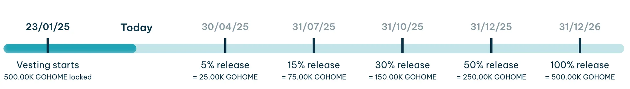 Toplam Arz: 9.999.619,45 (10 milyon hedef, 381 yakılmış). Dolaşım Arzı: 499.619,45. Kilitli: 9 milyon (4 yıl), 500 bin ekip (3-24 ay vesting). Likidite Havuzları: GOHOME/SOL ve GOHOME/USDC tamamen kilitli.