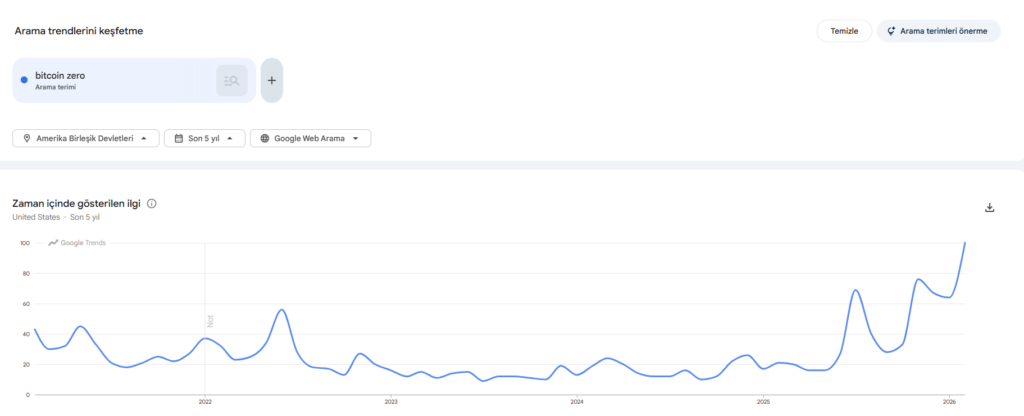 Google Trends verisine göre ABD’de “bitcoin zero” araması Şubat ayında 0–100 ölçeğinde tam 100 seviyesine ulaştı. Bu, seçilen zaman aralığındaki en yüksek göreli ilgi anlamına geliyor. İlginç olan şu: benzer arama patlamaları daha önce de görüldü. 2021 ve 2022’deki aynı tür sıçramalar, Bitcoin fiyatında yerel dip bölgelerine oldukça yakın gerçekleşmişti.