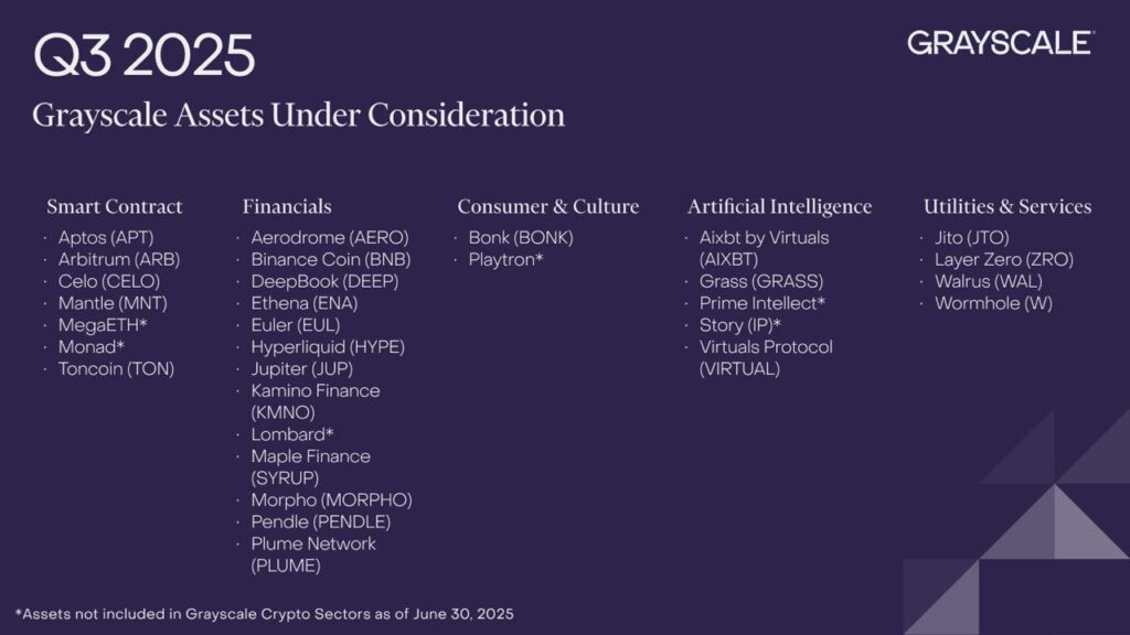 Grayscale, 2025 yılının üçüncü çeyreğine ait güncellenmiş kripto varlık listesini yayımladı. Şirket bu çeyrekte, toplam 31 token’ı değerlendirme altına aldı. Liste, önceki çeyrekteki 40 varlıkla karşılaştırıldığında daha sade bir yapı sunuyor. Bu durum, Grayscale’in değerlendirme süreçlerini daha stratejik hale getirdiğini gösteriyor.