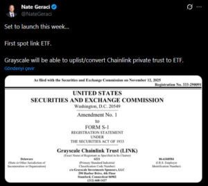 Nate Geraci, X üzerinden yaptığı paylaşımda Grayscale’in mevcut Chainlink Trust (LINK tröstü) ürününü spot bir ETF’e dönüştürmek için gerekli hazırlıkları tamamladığını belirtti. Geraci’ye göre bu dönüşüm, yalnızca teknik bir güncelleme değil; kurumsal yatırımcıların LINK’e doğrudan erişimini mümkün kılacak önemli bir adım niteliği taşıyor. Dönüşüm sürecinin başarıyla sonuçlanması hâlinde ürün, ABD’de borsada işlem gören ilk spot Chainlink ETF’i olarak tarihe geçecek. Böylece 2020’nin sonunda kurulan Chainlink Trust, yaklaşık beş yıllık geçmişinin ardından daha geniş kitlelere ulaşabilecek ETF formatına taşınmış olacak.