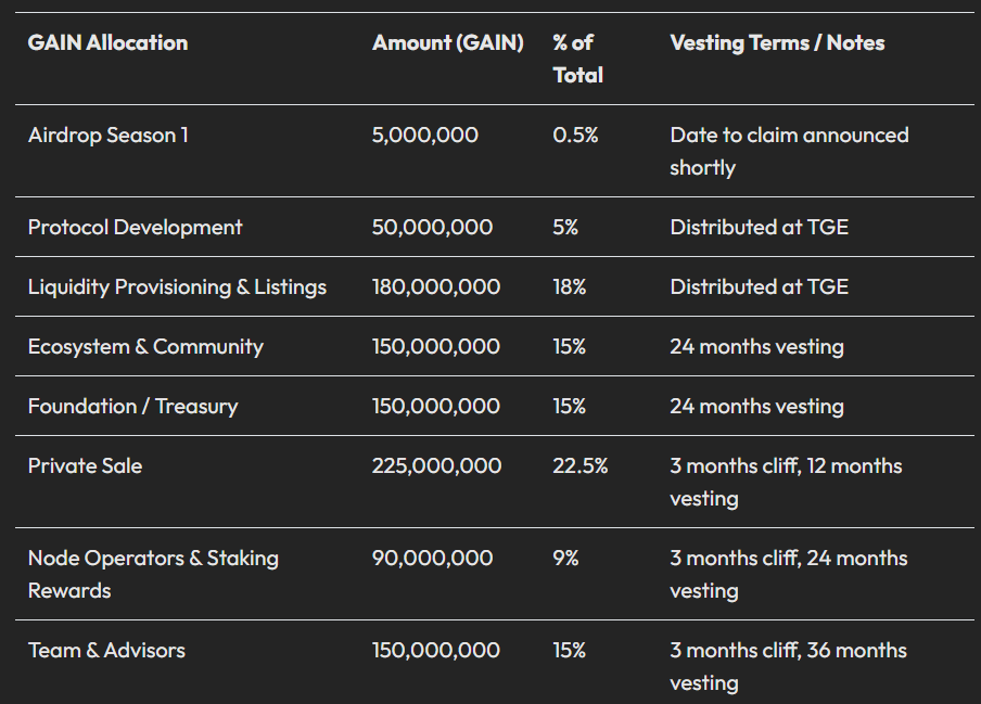 - Airdrop Season 1: 5,000,000 GAIN (0.5%)