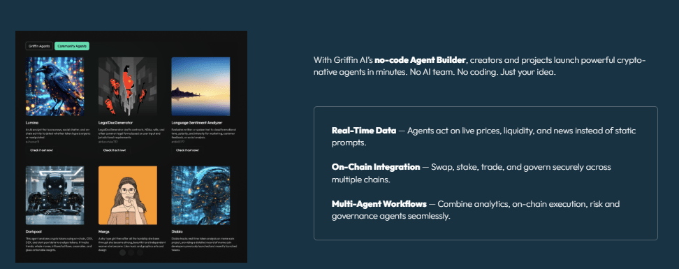 Griffin AI, blockchain uyumlu yapay zekâ ajanları geliştirmeyi hedefleyen bir ekosistem kuruyor. Platform, hem teknik kullanıcıların hem de kodlama bilmeyen yaratıcıların kendi AI ajanlarını oluşturmasına ve kullanmasına imkân tanıyor.