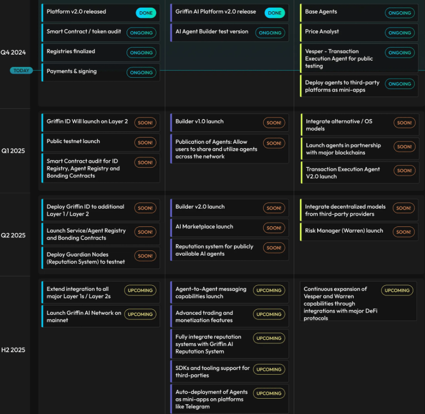 2025: Griffin ID’nin Layer 2 üzerinde lansmanı, herkese açık test ağının başlatılması, no-code Agent Builder’ın tamamlanması ve kullanıcıların ajan paylaşımı mümkün hale getirilecek. Ayrıca AI Agent Marketplace açılacak, alternatif ve merkeziyetsiz AI modelleri entegre edilecek ve Griffin Network ana ağı başlatılacak.