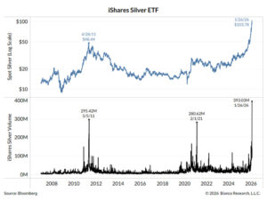 Gümüşe yönelik artan ilginin en net göstergelerinden biri, BlackRock’ın gümüş ETF’i tarafında görüldü. iShares Silver Trust (SLV), normal işlem hacminin yaklaşık 15 katına çıkarak dün 32 milyar dolara yakın işlem hacmine ulaştı. Bu olağanüstü hareketlilik, kurumsal ve bireysel yatırımcıların gümüşe olan ilgisinin kısa sürede ne denli güçlendiğini ortaya koyuyor. Elde edilen bu hacim, SLV’nin aynı gün S&P 500 ETF’inden, ayrıca Nvidia ve Tesla gibi küresel dev hisselerden bile daha fazla işlem gördüğünü gösterdi. Bu tablo, gümüşün yalnızca bir emtia değil, aynı zamanda küresel piyasalarda ön plana çıkan bir yatırım aracı haline geldiğine işaret ediyor.