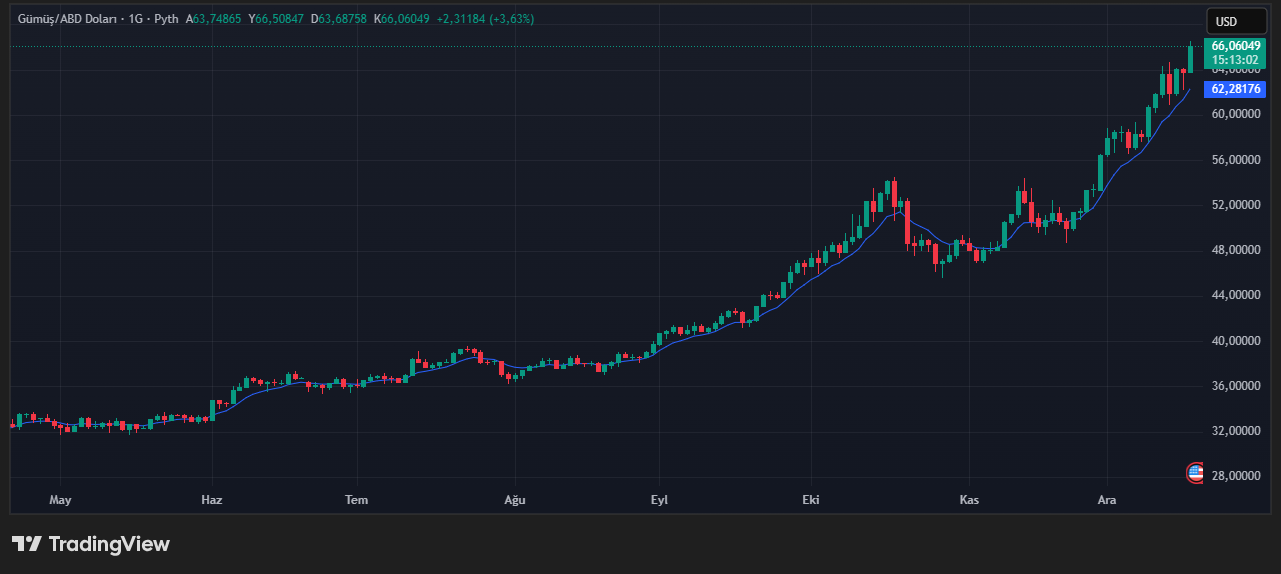 Küresel emtia piyasalarında dikkat çekici bir gelişme yaşanıyor. Ons gümüş, 66 dolar seviyesine ulaşarak tüm zamanların en yüksek değerini kaydetti. Bu tarihi yükseliş, hem kısa vadeli performans hem de uzun vadeli trend açısından gümüş piyasasının yeniden yatırımcıların radarına girdiğini gösteriyor.