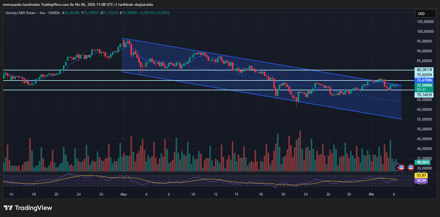 4 saatlik zaman diliminde XAG/USD, Mart başından bu yana düşüş kanalının üst bant direncine yakın bir seyir izlemekte olup anlık fiyat 72,50 dolar seviyesinde. Piyasa, ABD-İran ateşkes beklentilerine paralel olarak yön arayışı içindeki konsolidasyon görünümünü korumaktadır.