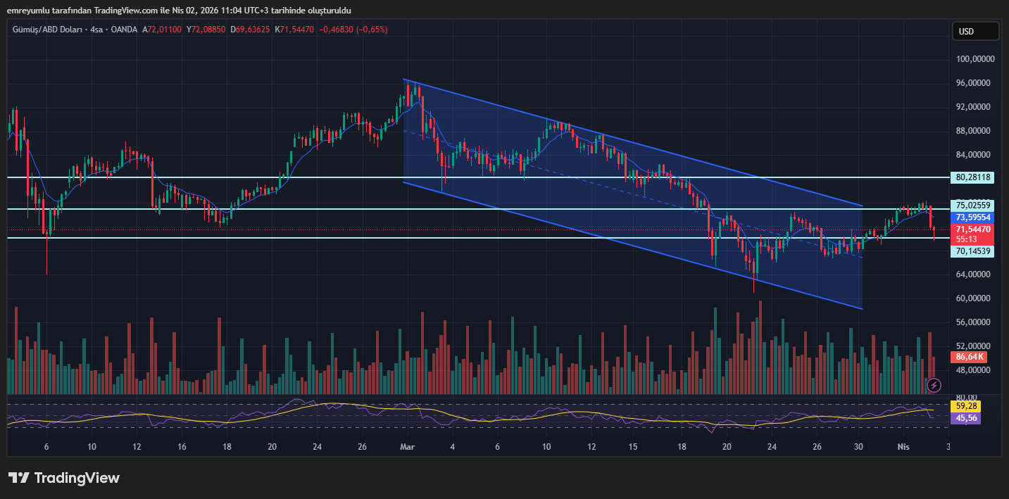 Önceki analizimizde 75 dolar direncinin güçlü yapısını ve bu seviyenin kırılabileceğini belirtmiştik. Seviye gerçekten de geçildi. Ancak Trump’ın ulusa sesleniş konuşmasıyla birlikte tablo değişti. Gümüş, konuşmayla anlık olarak 70 dolar desteğinin de altına fitil attı. Yalnız fiyat hızla toparlandı ve bu kritik seviyeyi kapanış bazında korudu. Şu an ons gümüş, yüzde 4,86 düşüşle 71,41 dolar seviyesine çekilmiş durumda.