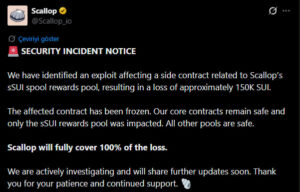 Kripto para piyasasında hack olayları hız kesmeden devam ediyor ve güvenlik riskleri yatırımcıların gündeminde üst sıralarda yer almayı sürdürüyor. Son haftalarda art arda yaşanan saldırılar, özellikle DeFi projelerine yönelik tehditlerin arttığını gösterirken, bu kez Sui ekosisteminde faaliyet gösteren borç verme protokolü Scallop, güvenlik açığı nedeniyle zarar yaşandığını duyurdu. Yaşanan olay, piyasada kısa süreli tedirginlik yaratırken, platform tarafından hızlı şekilde yapılan açıklamada kullanıcı varlıklarının güvende olduğu ve sorunun sınırlı bir alanda kaldığı vurgulandı. Ayrıca ekip, sürece anında müdahale edildiğini belirterek daha büyük bir kaybın önüne geçildiğini ifade etti.