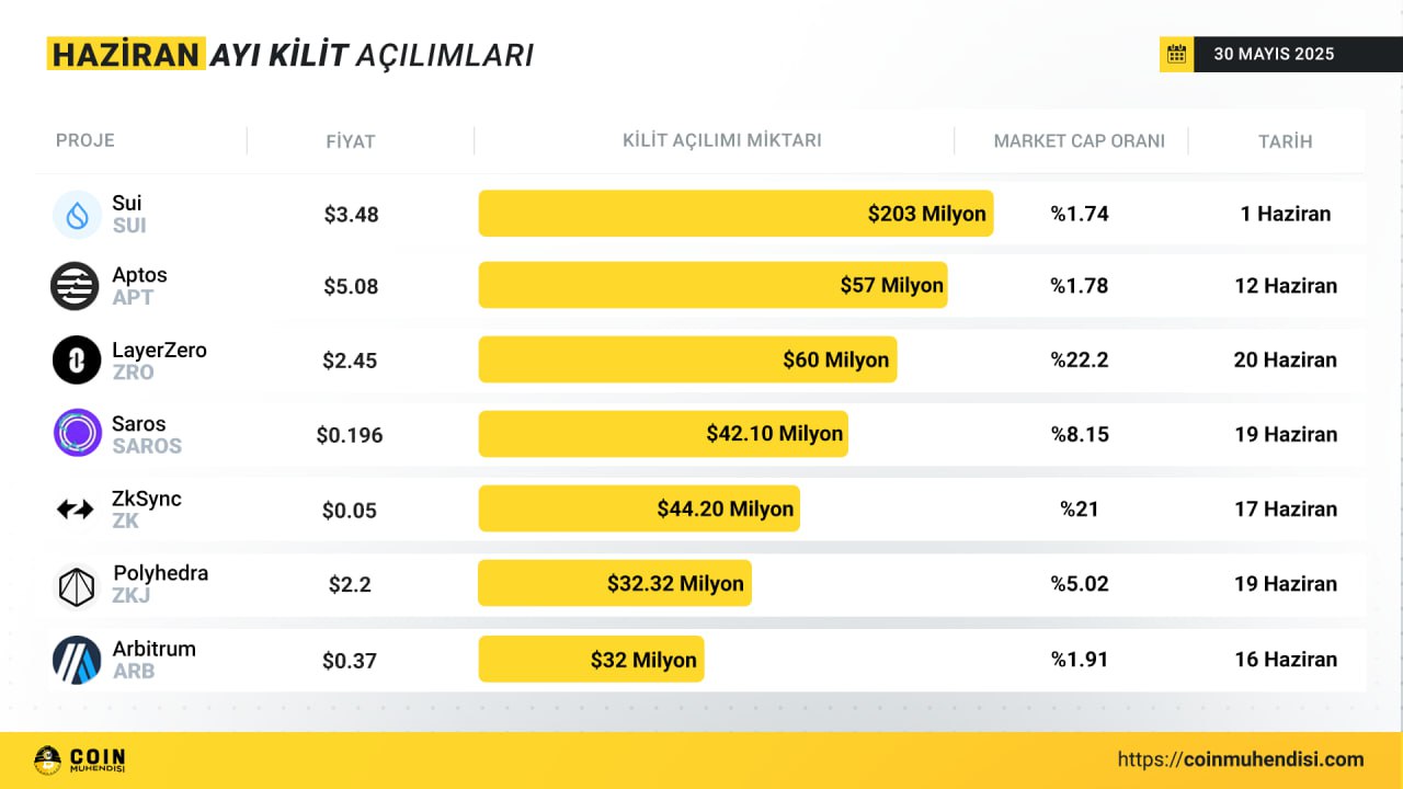 Kripto piyasasında yatırımcılar için önemli etkenlerden biri de kilit açılımı (token unlock) tarihleri. Belirli tarihlerde kilidi açılan token’lar piyasaya sürülerek dolaşıma katılıyor ve bu durum genellikle fiyatlar üzerinde baskı yaratabiliyor. Haziran 2025’te birçok büyük proje önemli miktarda kilit açılımına sahne olacak.