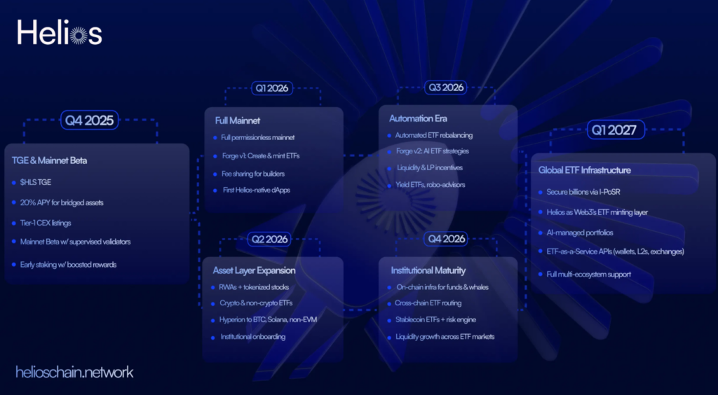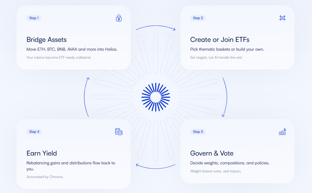 Helios Blockchain, zincir üstü portföy ürünlerinin oluşturulması, yönetilmesi ve otomatik olarak çalıştırılması için tasarlanmış bir Layer-1 blokzincir ağıdır. Ağın temel odağı; endeks fonları, ETF benzeri ürünler, çok varlıklı sepetler ve otomatik yatırım stratejilerinin tamamen on-chain, şeffaf ve doğrulanabilir şekilde çalışmasını sağlamaktır. Helios, farklı blokzincir ekosistemlerindeki varlıkları tek bir mantık ve muhasebe çerçevesi altında birleştirmeyi hedefler.