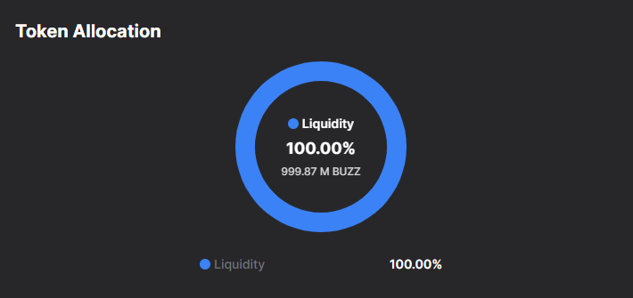 Hive’in yerel tokeni $BUZZ, katı bir meme coin olarak tanımlanıyor. Token dağılımı oldukça basit: tüm tokenler likidite için ayrılmış ve toplam 999,87 milyon $BUZZ tokeni dolaşıma sokulmuştur. Bu yapı, projenin erken aşamada likiditeyi sağlam tutmayı hedeflediğini gösteriyor.